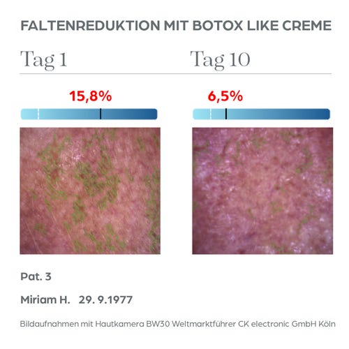 Wrinkle depth reduction after using WRINKLΞSS CODE™ B-TOX EFFECT Face Cream: from 15.8 to 6.5 – a 58.86% visible improvement.